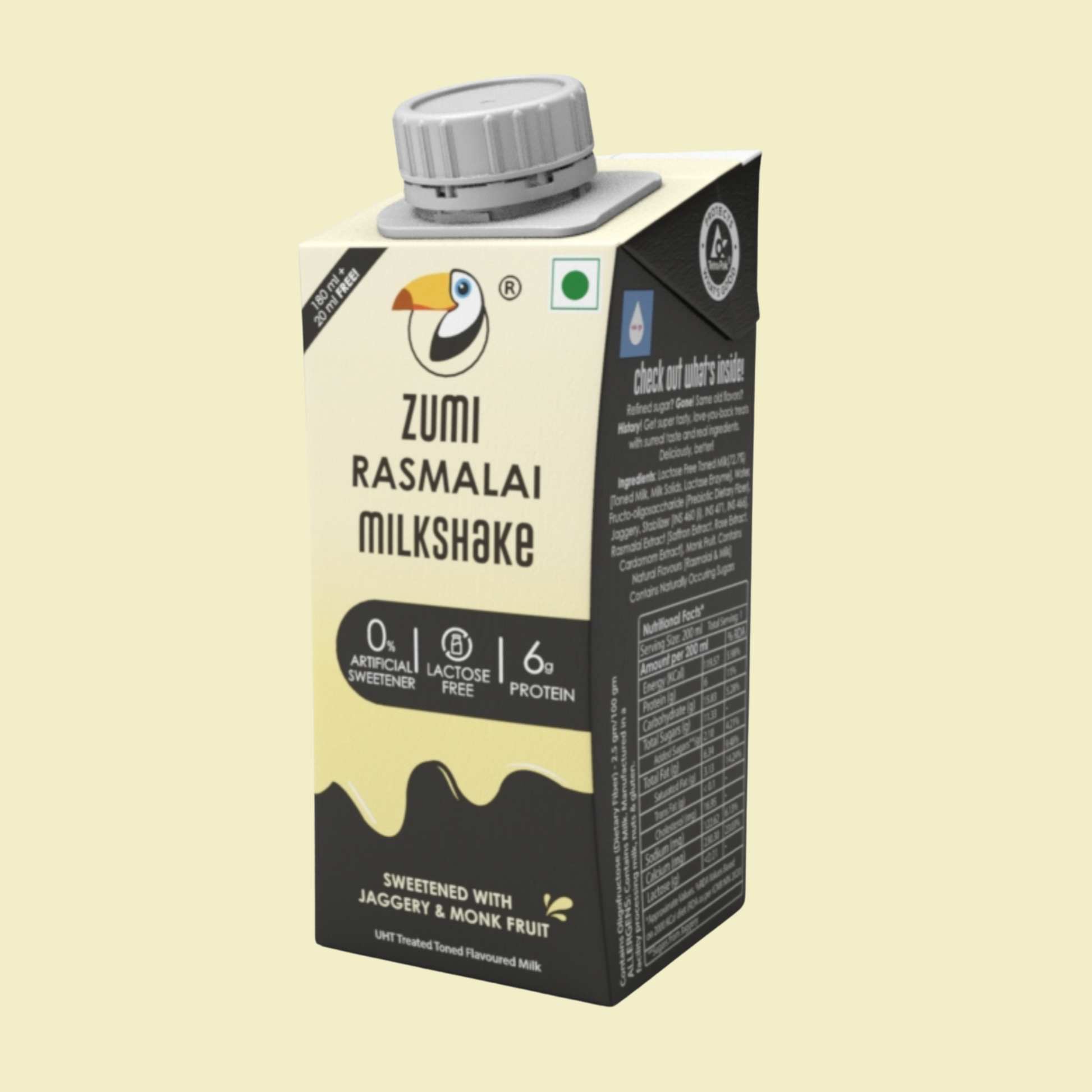 Our No Added Sugar, Lactose-Free Milkshakes are a great source of protein and calcium. ZUMI Rasmalai Milk is made with real ingredients. No Flavours, Colours and Preservatives. No Nasties!